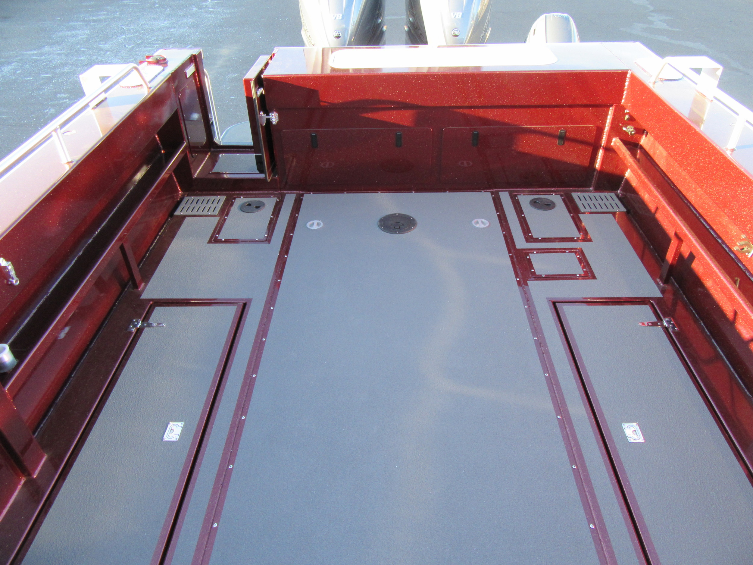 - Side mounted in floor fish boxes (optional macerator pumps)